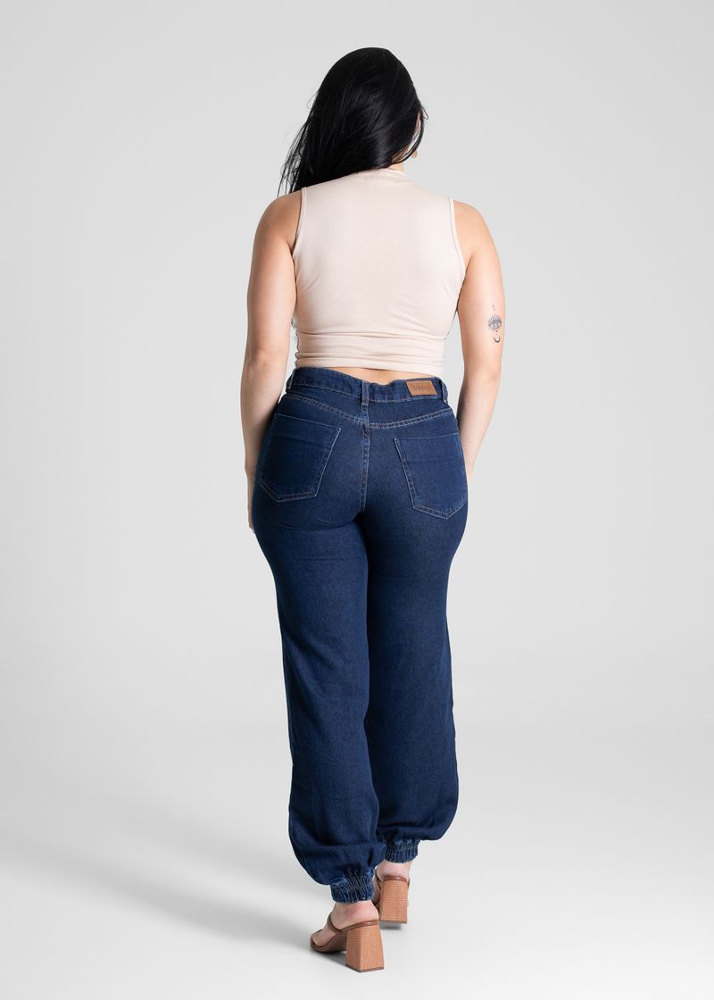 Calça feminina confeccionada em jeans. A calça balonê é um modelo caracterizado pelo volume arredondado concentrado na região das pernas, criando uma silhueta ampla e estruturada, que lembra um balão. Cintura alta Fechamento com botão e zíper Bolsos frontais e bolsos traseiros funcionais Barra com elástico Tecido: Jeans Tipo de lavagem: Azul Cor: Azul escuro