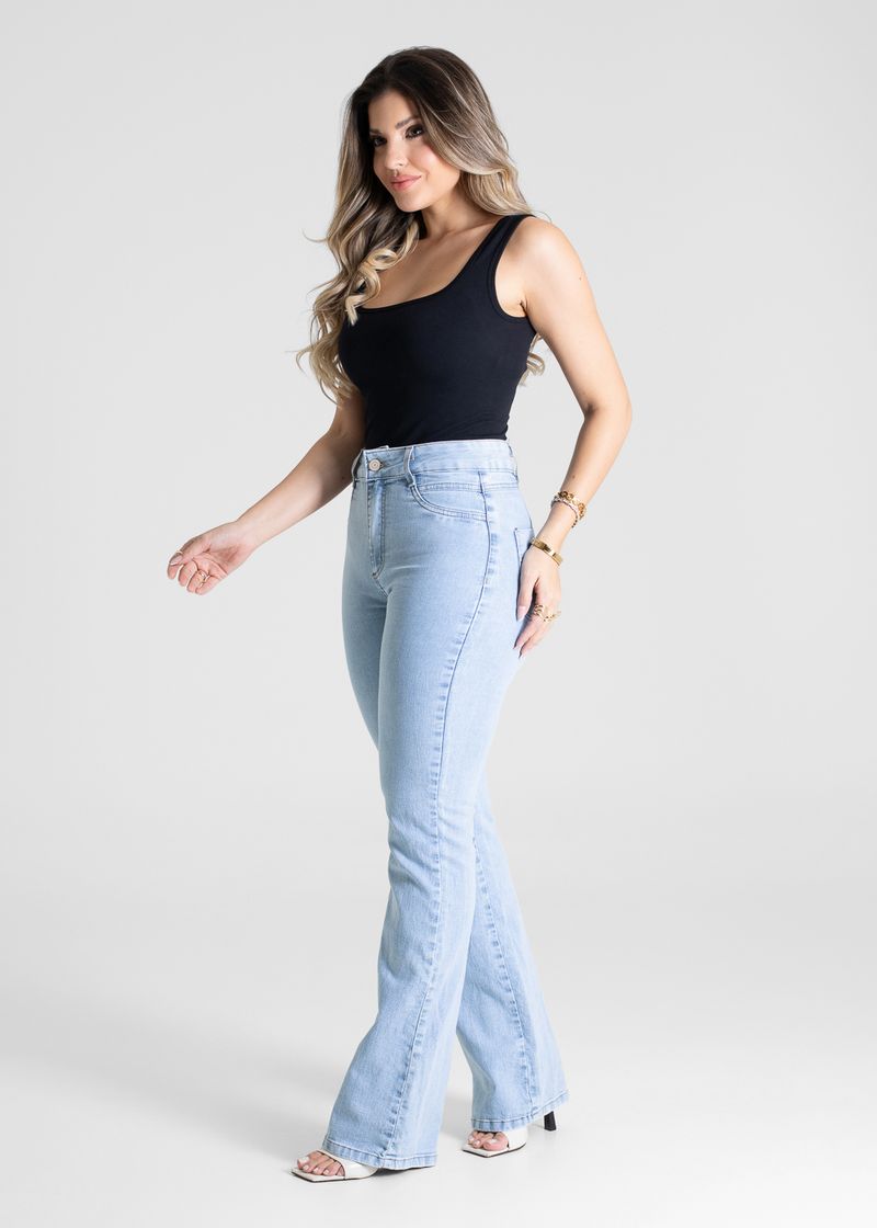 A modelagem boot cut tem o caimento ajustado nas pernas e levemente ampla barra. Cintura media Fechamento com botão e zíper Bolsos frontais falsos e posteriores funcionais Barra simples Modelagem: boot cut Tecido: Jeans Tipo de lavagem: Azul Cor: Azul claro