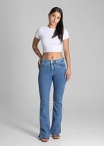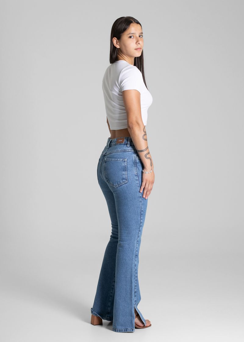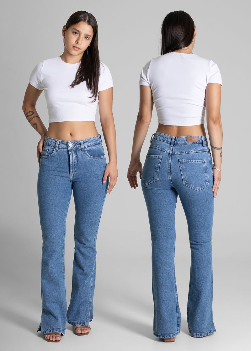 A modelagem boot cut tem o caimento ajustado nas pernas e levemente ampla barra. Cintura media Fechamento com botão e zíper Bolsos frontais e posteriores funcionais Barra fenda lateral Modelagem: boot cut Tecido: Jeans Tipo de lavagem: Azul Cor: Azul médio