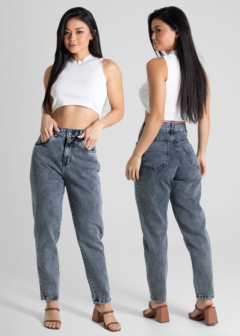 Calça mom confeccionada em jeans. A modelagem mom tem um caimento soltinho nos quadris e coxas ajustando até o tornozelo. Cintura alta Fechamento com botão e zíper Bolsos frontais e bolsos traseiros funcionais Barra simples Modelagem: Mom Tecido: Jeans Tipo de lavagem: Azul Cor: Azul