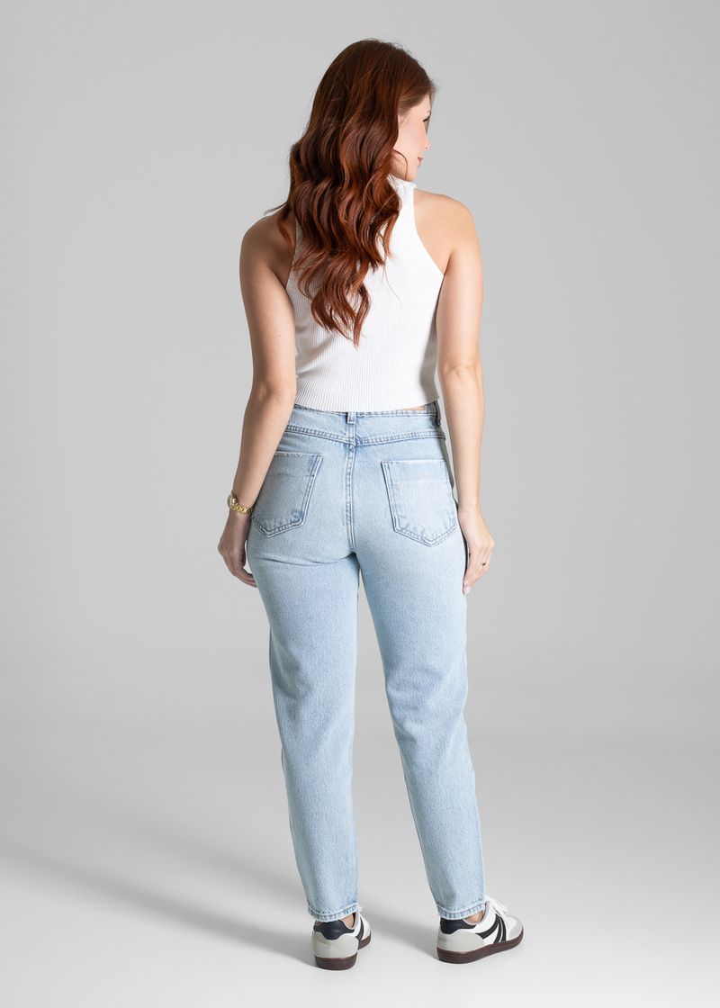 Calça mom confeccionada em jeans. A modelagem mom tem um caimento soltinho nos quadris e coxas ajustando até o tornozelo. Cintura alta Fechamento com botão e zíper Bolsos frontais e bolsos traseiros funcionais Barra simples Modelagem: Mom Tecido: Jeans Tipo de lavagem: Azul Cor: Azul claro