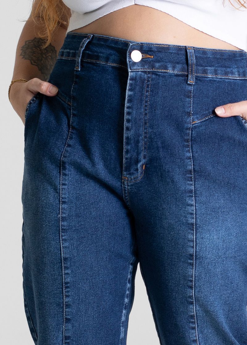 Calça plus size confeccionada em jeans. A modelagem mom tem um caimento soltinho nos quadris e coxas ajustando até o tornozelo. Cintura alta Fechamento com botão metálico e zíper Bolsos frontais e posteriores funcionais Barra simples Modelagem: Plus size mom Tecido: Jeans Tipo de lavagem: Azul Cor: Azul