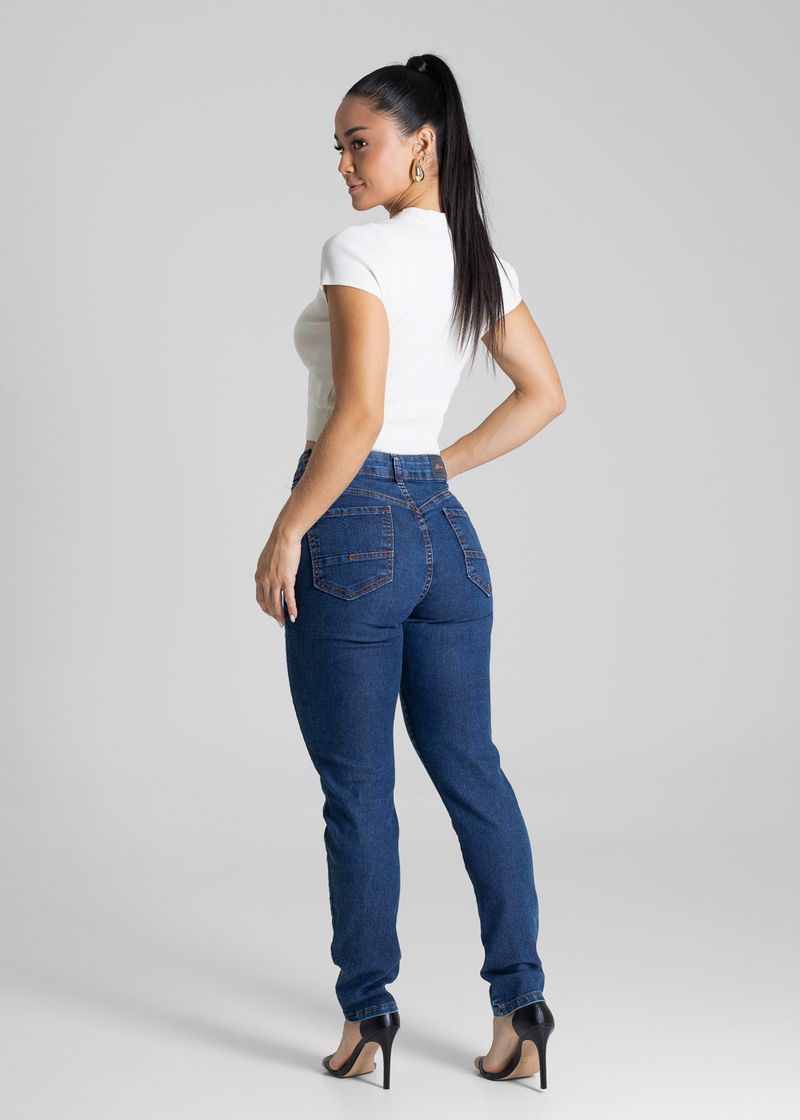Calça push up confeccionada em jeans. A modelagem tem tecnologia para dar um UP na silhueta. Cintura média Fechamento com botão metálico e zíper Bolsos frontais falsos e bolsos traseiros funcionais Barra cortada Modelagem: Push up Tecido: Jeans Tipo de lavagem: Azul Cor: Azul médio