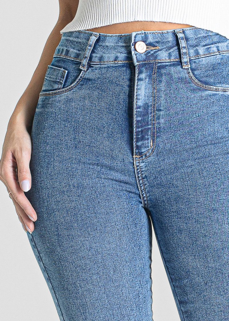 Calça push up confeccionada em jeans. A modelagem tem tecnologia para dar um UP na silhueta. Cintura média Fechamento com botão metálico e zíper Bolsos frontais falsos e bolsos traseiros funcionais Barra cortada Modelagem: Push up Tecido: Jeans Tipo de lavagem: Azul Cor: Azul médio