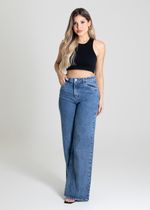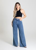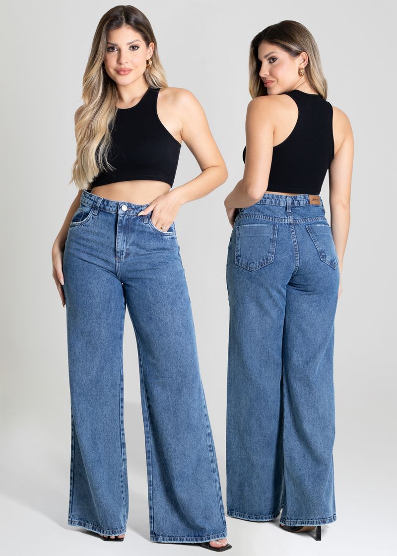 Calça feminina confeccionada em jeans. O modelo possui cintura super alta, gancho no lugar e caimento amplo da coxa até a barra. Cintura alta Fechamento através de um botão e zíper Bolsos frontais e posteriores funcionais Barra desfiada Tecido: Jeans Tipo de Lavagem: Azul Cor: Azul