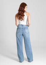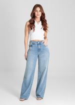 Calça feminina confeccionada em jeans. O modelo possui cintura super alta, gancho no lugar e caimento amplo da coxa até a barra. Cintura alta Fechamento através de um botão e zíper Bolsos frontais e posteriores funcionais Barra desfiada Tecido: Jeans Tipo de Lavagem: Azul Cor: Azul