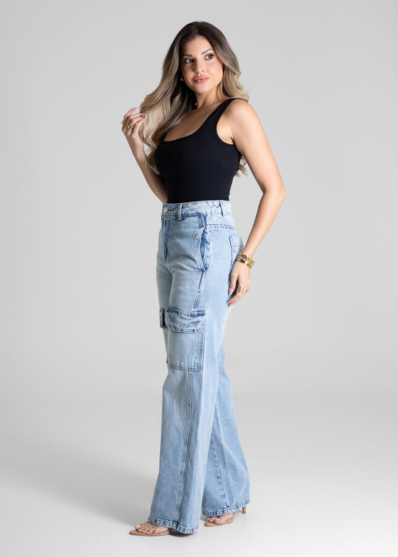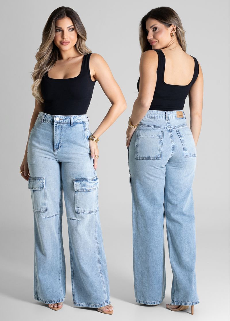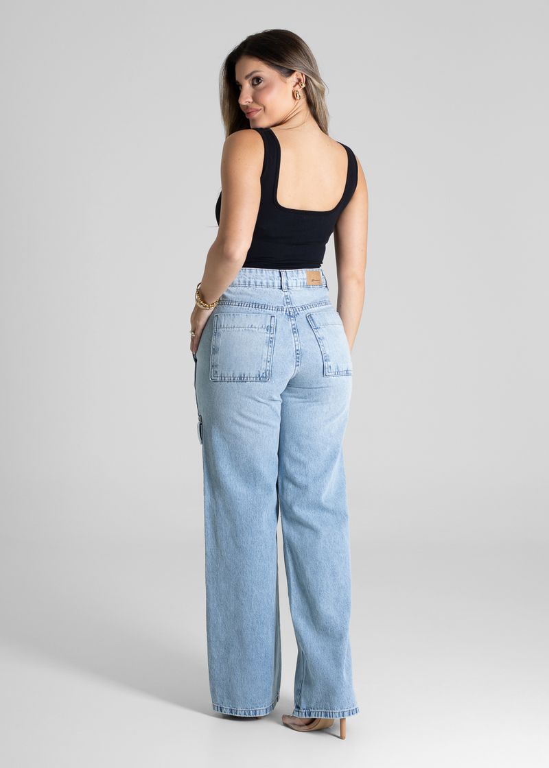 Calça feminina confeccionada em jeans. O modelo possui cintura super alta, gancho no lugar e caimento amplo da coxa até a barra. Cintura alta Fechamento através de um botão e zíper Bolsos frontais e posteriores funcionais Barra simples Tecido: Jeans Tipo de Lavagem: Azul Cor: Azul claro