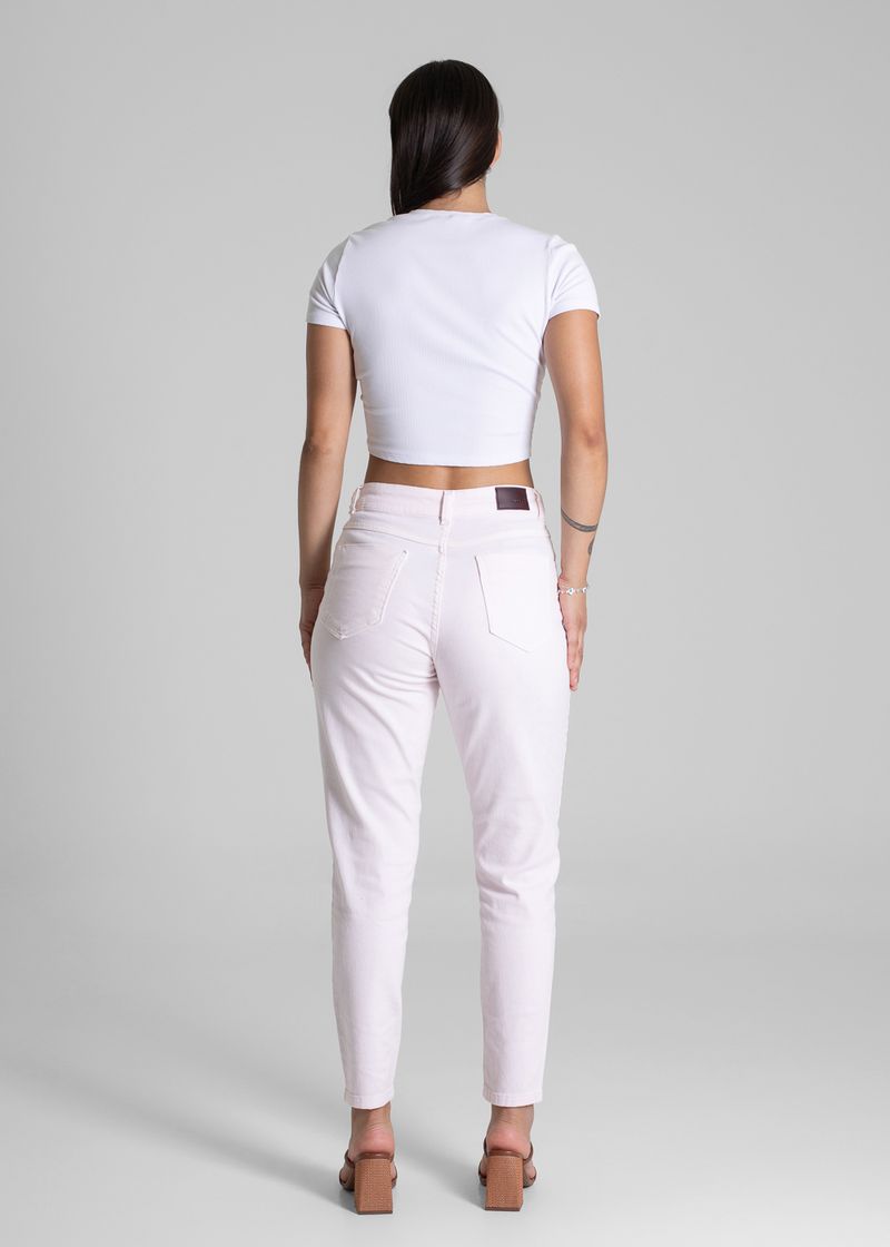 Calça mom confeccionada em sarja. A modelagem mom tem um caimento soltinho nos quadris e coxas ajustando até o tornozelo. Cintura alta Fechamento com botão e zíper Bolsos frontais e bolsos traseiros funcionais Barra simples Modelagem: Mom Tecido: Sarja Tipo de lavagem: Color Cor: Rosa