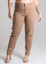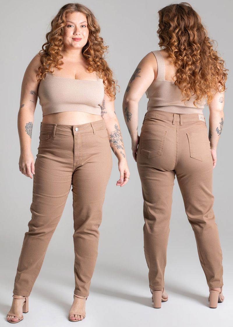 Calça plus size confeccionada em sarja. A modelagem tem tecnologia para dar um UP na silhueta Cintura alta Fechamento com botão metálico e zíper Bolsos frontais falsos e bolsos traseiros funcionais Barra simples Modelagem: Plus size Tecido: Sarja Tipo de lavagem: Color Cor: Bega capuccino