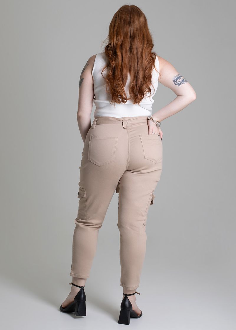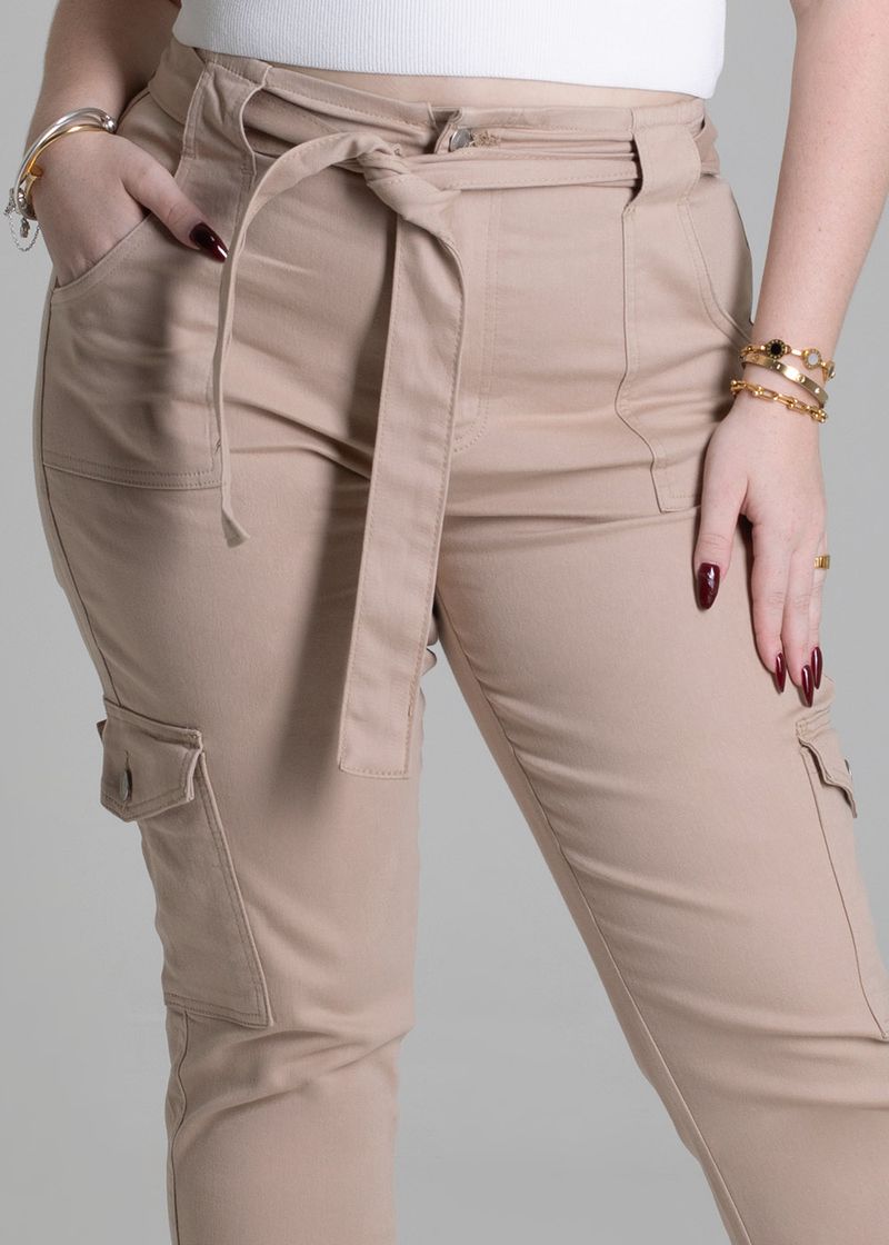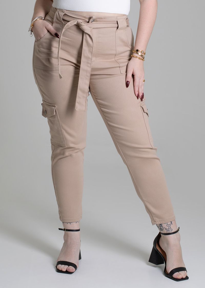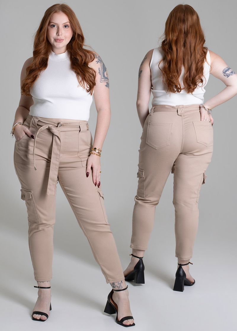 Calça plus size com recorte confeccionada em sarja. A modelagem mom tem um caimento soltinho nos quadris e coxas ajustando até o tornozelo. Cintura alta, cós acompanha um cinto com o mesmo tecido para amarração Fechamento com botão e zíper Bolsos laterais cargos e bolsos traseiros funcionais Barra simples Modelagem: Mom Tecido: Sarja Tipo de lavagem: Color Cor: Bege