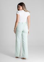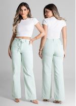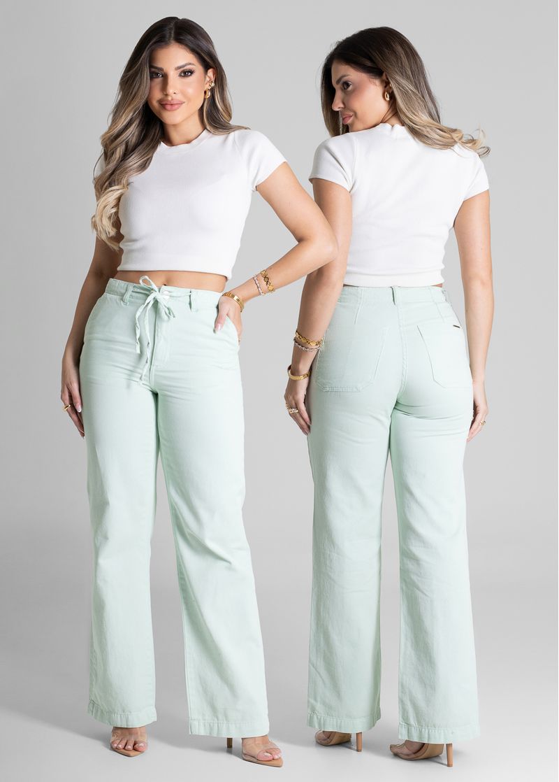 Calça feminina confeccionada em sarja. O modelo possui cintura super alta, gancho no lugar e caimento amplo da coxa até a barra. Cintura alta Fechamento através de um botão e zíper..cós acompanha cordão com o mesmo tecido para amarração Bolsos frontais e posteriores funcionais Barra simples Tecido: Sarja Tipo de Lavagem: Color Cor: Verde