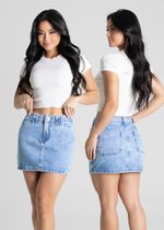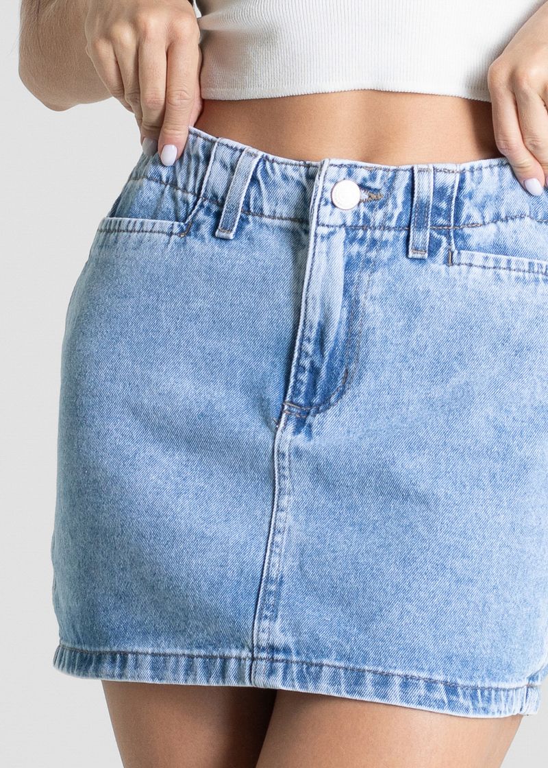 Saia mini feminina confeccionada em jeans O modelo tem comprimento curto e caimento ajustado. A parte frontal tem fechamento com botão e zíper Bolsos posterior funcional A barra tem acabamento simples Tecido: Jeans Tipo de lavagem: Azul Cor: Azul médio